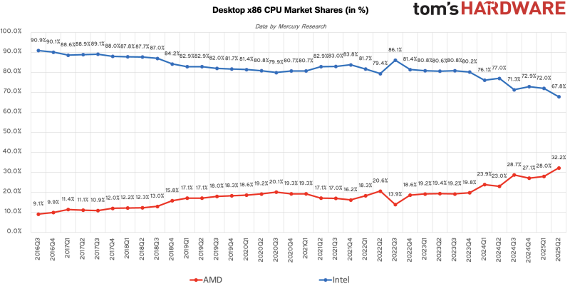 Embora a Intel continue a superar a AMD no mercado de PCs desktop, é aqui que a AMD está registrando um crescimento impressionante. A participação da AMD no segmento cresceu para 32,2% no segundo trimestre de 2025, um aumento de 4,2% em relação ao trimestre anterior e de 9,2% em relação ao ano anterior. A participação da Intel no mercado de processadores para desktop foi de 67,8%, queda tanto no trimestre quanto na comparação anual. Em outras palavras, a Intel agora supera a AMD em 2:1, ante 8:2 em 2023 e 9:1 entre 2016 e 2018.
