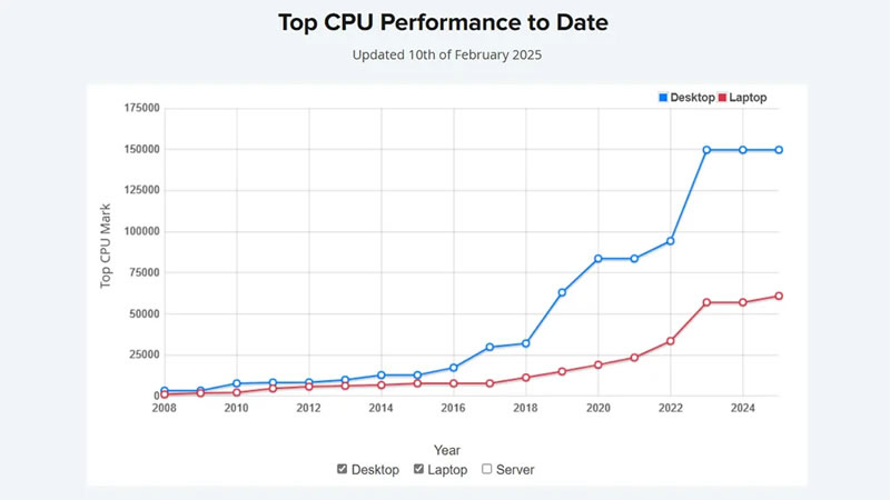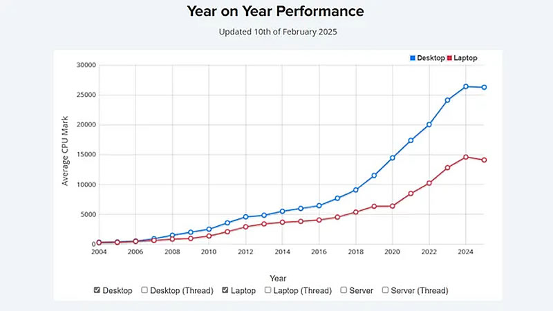 O maior declínio foi registrado em laptops. Em 2024, o resultado médio dos testes desses dispositivos foi de 14.632 pontos (com base em 101.316 testes) e em 2025 foi de 14.130 pontos com base em 25.541 testes, uma queda de 3,4%. O desempenho dos PCs de mesa também caiu. A pontuação média em 2024 foi de 26.436 pontos com base em 186.053 testes. Em 2025, esse número caiu para 26.311 pontos (47.810 testes), o que equivale a uma queda de 0,5%. Embora essa queda seja pequena, tendências de longo prazo sugerem que os processadores devem ficar mais rápidos.