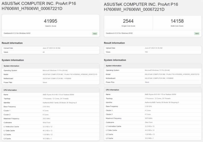 A entrada do banco de dados Geekbench não informa em qual TDP o chip estava rodando durante o teste. Porém, sabe-se que o processador foi utilizado no laptop ASUS ProArt A16, que não vinha equipado com placa de vídeo discreta. Lembramos que o consumo de energia dos processadores Ryzen AI 300 é dinâmico e pode variar de 15 a 45 W.