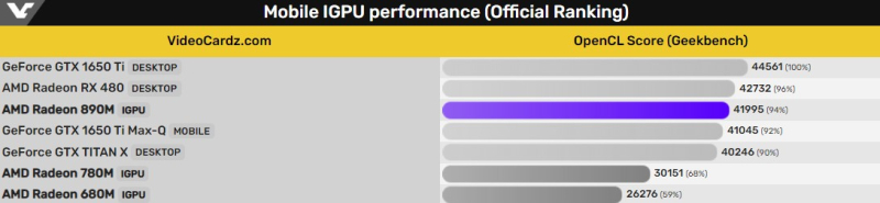 No teste OpenCL, os gráficos integrados da Radeon 890M apresentaram resultado de 41.995 pontos. Isso é 39% a mais do que a geração anterior de gráficos integrados Radeon 780M baseados na arquitetura RDNA 3.