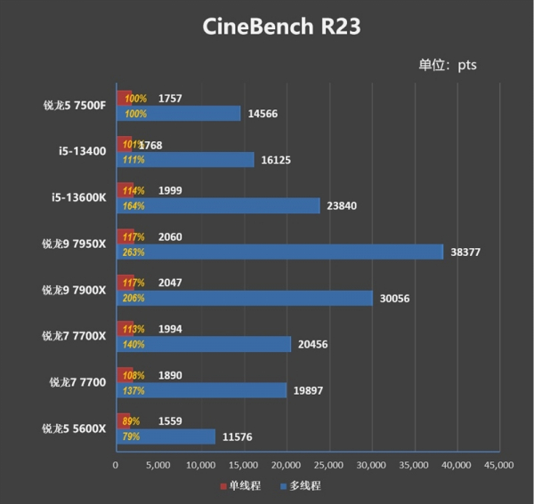 A mídia local e os blogueiros de tecnologia compararam o novo produto da AMD com os processadores Intel Core i5-13400 e Core i5-13500. O Ryzen 5 7500F oferece seis núcleos com 12 threads, clocks de até 5,0 GHz e um TDP reivindicado de 65 W. Os chips Intel têm o mesmo TDP nominal. O modelo Core i5-13400 oferece 10 núcleos (6P + 4E) e opera em até 4,6 GHz. Por sua vez, o Core i5-13500 oferece 14 núcleos (6P + 8E) com suporte para 20 threads e roda em até 4,8 GHz.