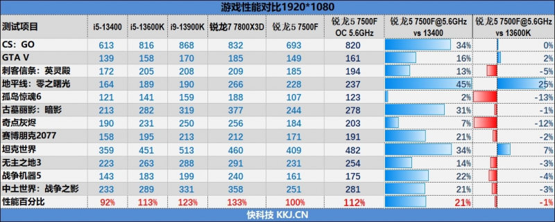 Ryzen 5 7500F desempenho médio em jogos a 1080p. Fonte da imagem: QuasarZone