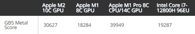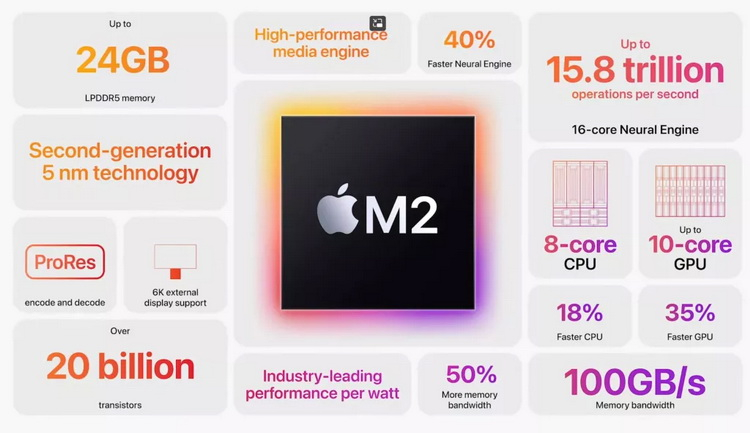 O desempenho de computação no teste Geekbench 5 de núcleo único para chips Apple M2 em comparação com o Apple M1 é até 10% maior e multi-core – até 16%. O desempenho gráfico recebeu um aumento mais significativo, até 67% mais rápido do que os chips gráficos Apple M1 da geração anterior. O teste abrangente do Geekbench 5 não reflete o desempenho do mundo real em alguns cenários, mas os benchmarks inteiros e de ponto flutuante dão uma ideia do que você pode esperar dos novos chips da Apple.