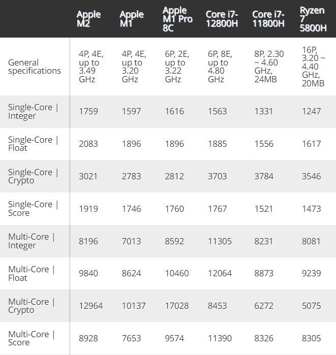 Em geral, o desempenho de computação de thread único do Apple M2 não é muito superior ao de seu antecessor. No entanto, os novos núcleos Avalanche são significativamente mais rápidos do que os núcleos Golden Cove usados nos processadores móveis Intel Core (Alder Lake-H) de 12ª geração. O desempenho multi-thread do Apple M2 é 16% mais rápido que o M1. Mas fica atrás do móvel Alder Lake-H.