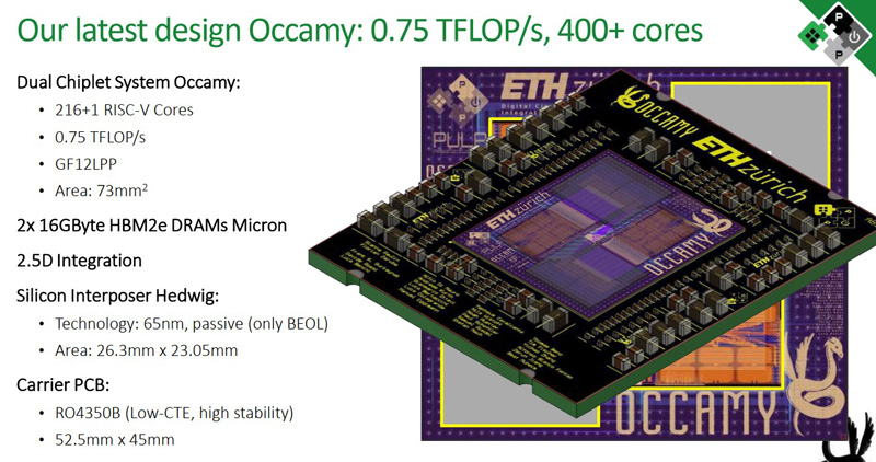 O design digital do processador ficou pronto no final do ano passado. Agora está sendo montado. A primeira implementação da Occamy consiste em dois chipsets de computação idênticos, cada um com 216 núcleos RISC-V de baixa potência e 16 GB de memória HBM2e fornecida pela Micron. Além disso, cada matriz contém um núcleo de computação de controle de 32 bits para distribuir uniformemente a carga de computação em matrizes de núcleos RISC-V. Pesquisadores da ETH Zürich e da Universidade de Bolonha estiveram diretamente envolvidos no projeto da solução, embora o próprio chip tenha sido desenvolvido como parte do programa pan-europeu EuPilot.