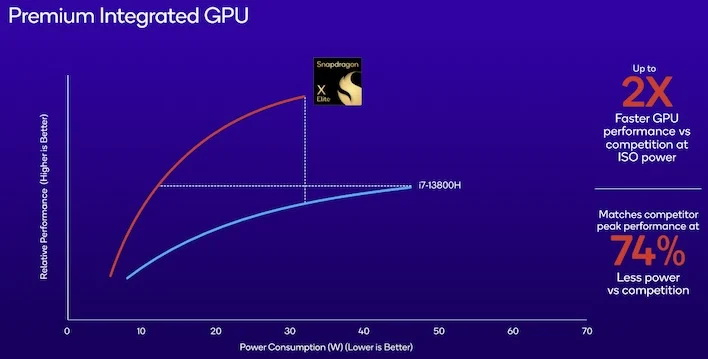 O Snapdragon X Elite possui um núcleo gráfico Adreno integrado que oferece desempenho de 4,6 teraflops. A GPU integrada é 80% a 2 vezes mais poderosa do que os gráficos integrados dos concorrentes, diz a Qualcomm, ao mesmo tempo que é 20-25% mais eficiente em termos energéticos. A empresa tira suas conclusões com base nos testes 3DMark Wild Life Extreme. O subsistema gráfico também afirma suportar telas com resoluções de até 4K, taxas de atualização de até 120 Hz no modo HDR10.