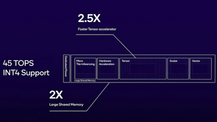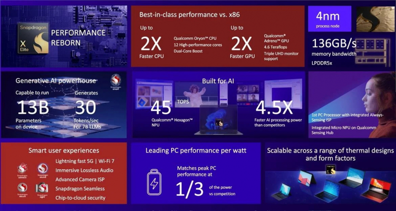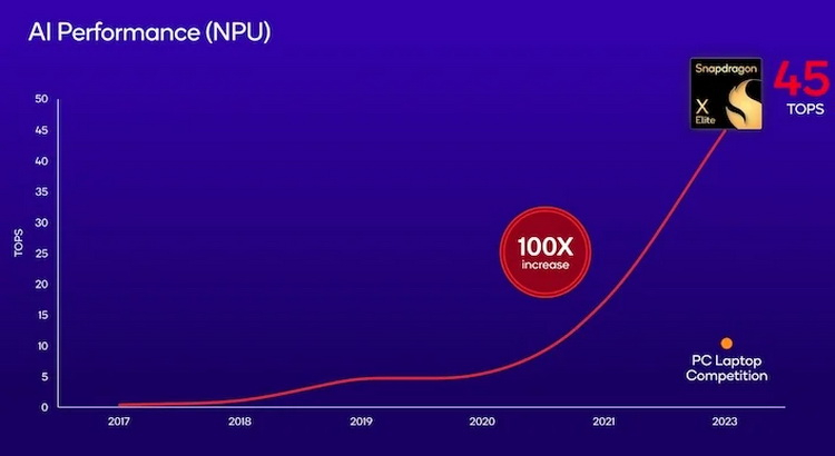 O chip pode executar modelos generativos de linguagem grande (LLMs) com mais de 13 bilhões de parâmetros. Além disso, o NPU é responsável por recursos avançados de segurança, privacidade, funções de autorização e até mesmo pela operação do dispositivo baseado no Snapdragon X Elite no modo de suspensão.