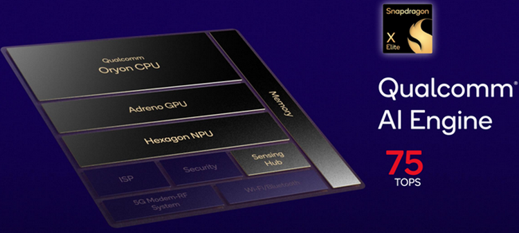 O processador Snapdragon X Elite também possui um Qualcomm AI Engine especializado com desempenho combinado de até 75 TOPS. O coprocessador Hexagon NPU (Unidade de Processamento Neural) incluído nele oferece desempenho de 45 TOPS em operações INT4, o que é até 4,5 vezes a capacidade dos processadores atuais que podem ser encontrados nos laptops modernos do mercado, afirma a empresa.
