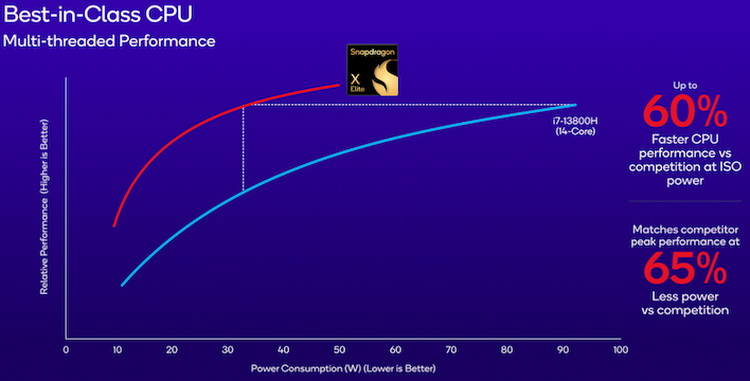 De acordo com os testes de desempenho multithreaded do Geekbench 6.1, o processador Snapdragon X Elite entrega até duas vezes o desempenho de seu concorrente, mas utiliza 1/3 da potência deste último.