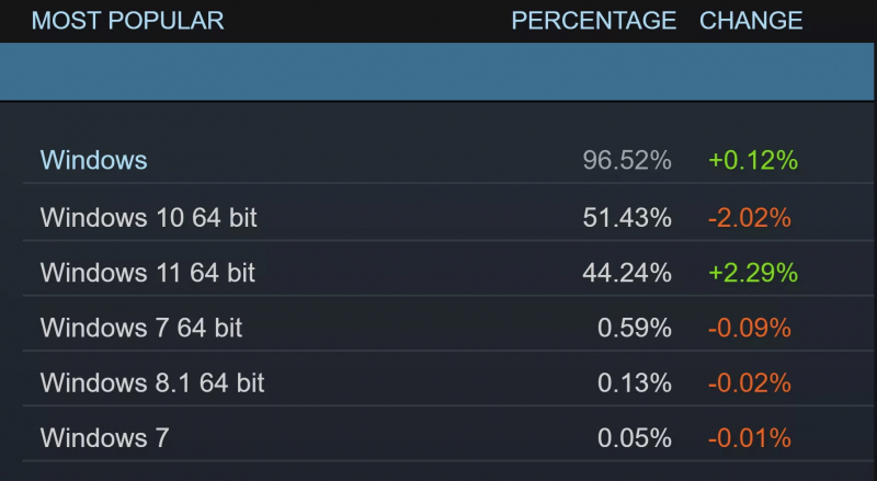 A Microsoft certamente ficará feliz em saber que a participação de usuários do Windows 11 na plataforma Steam aumentou em janeiro. No final do mês passado, 44,2% dos participantes da pesquisa utilizavam este SO. Por sua vez, a quota de utilizadores do Windows 10 diminuiu mais 2 pontos percentuais. e ao final do mês era de 51,4%. Um pouco mais e o Windows 11 será instalado em metade dos usuários do Steam. Outra coisa é o mercado como um todo, onde o quadro do Windows 11 não parece tão otimista. O sistema operacional mais recente da Microsoft está instalado em apenas 26,5% dos PCs, enquanto o Windows 10 é responsável por 67,4% dos usuários.