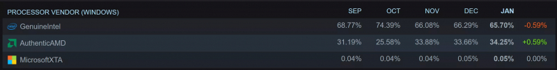 A Valve publicou estatísticas sobre os sistemas de usuários do Steam em janeiro. Embora este mês seja considerado pouco ativo entre os compradores, a AMD conseguiu aumentar a participação de seus processadores ao nível mais alto da história da plataforma Steam, e a participação de usuários do sistema operacional Windows 11, por sua vez, continua a aproximar-se gradualmente de 50%.