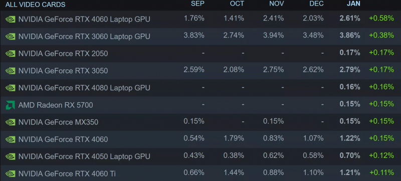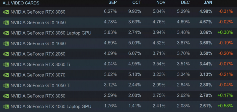 Janeiro mostrou que a popularidade dos laptops para jogos está crescendo entre os usuários do Steam. Por exemplo, sistemas com GeForce RTX 4060 móvel aumentaram sua participação na plataforma em 0,58 pontos percentuais. O crescimento também foi observado no RTX 3060 móvel (+0,38 p.p.). O mesmo RTX 4060 móvel acabou sendo o quinto em popularidade, e o RTX 4050 mais jovem ficou em nono lugar.