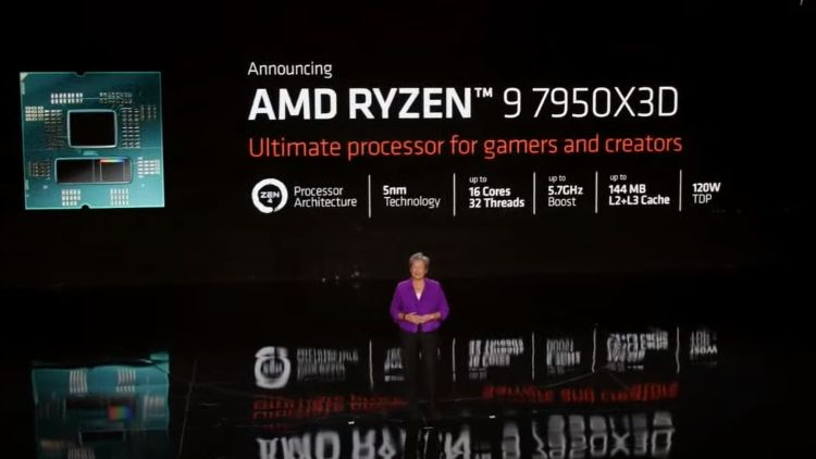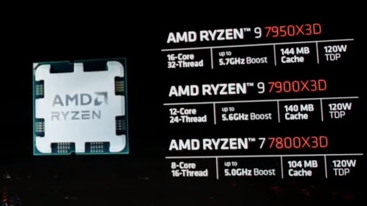 Traçando um paralelo com o Ryzen 7 5800X3D, que foi o primeiro a experimentar a memória 3D V-Cache, Lisa Su começou sua história com o Ryzen 7 7800X3D mais jovem, que oferecerá 8 núcleos e 16 threads, frequências de até 5,0 GHz e um total de 104 MB de cache. A linha será coroada com um Ryzen 9 7950X3D de 16 núcleos com faixa de frequência operacional de 4,2 a 5,7 GHz e 144 MB de cache, e entre eles haverá um Ryzen 9 7900X3D com 12 núcleos e 140 MB de cache. Sua faixa de frequência operacional será de 4,4 a 5,6 GHz. Todos os três processadores terão um nível de TDP de não mais que 120 watts.