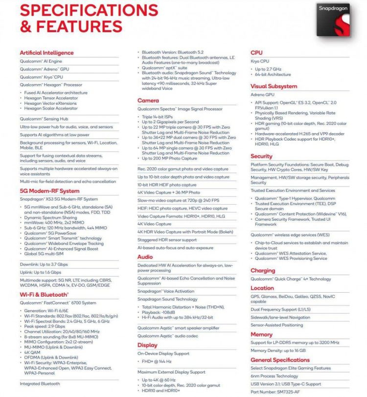 Assim como o chip anterior, a novidade suporta a tecnologia de carregamento rápido Quick Charge 4+, que permite recarregar a bateria do smartphone em até 50% em 15 minutos. Além disso, o novo processador usa a mesma arquitetura Fused AI Accelerator, o mesmo processador de sinal Qualcomm Spectra ISP com taxas de bits de até 2 gigapixels por segundo e suporta câmeras de até 200 MP. O modem no Snapdragon 782G também permaneceu o mesmo. Este é um Snapdragon X53 com suporte 5G na banda sub-6GHz e mmWave. Para a novidade, também é anunciado o módulo FastConnect 6700 com suporte para Wi-Fi 6 em velocidades de até 2,9 Gb/s e Bluetooth 5.2. Outras características do chip podem ser encontradas na tabela abaixo.