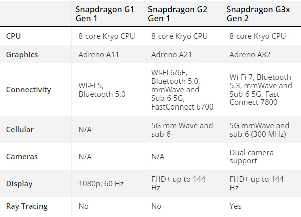 Snapdragon G3x Gen 2 é o carro-chefe entre os novos produtos. A plataforma usa oito núcleos Kryo, além da GPU Adreno A32. O processador suporta os padrões sem fio Wi-Fi 7 e Bluetooth 5.3, bem como 5G em bandas de até 6 GHz e mmWave. Este chip é o único entre os apresentados que suporta tecnologia de ray tracing, além de conectar câmeras.
