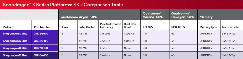 A Qualcomm também lançará três processadores Snapdragon X Elite de 12 núcleos com clock de 3,8 GHz e gráficos integrados com até 4,6 Tflops – todos os três modelos têm o mesmo NPU e suporte de memória no nível Snapdragon X Plus. Os dois modelos top da linha se diferenciam pela função Dual-Core Boost (até 4,2 GHz) – uma espécie de análogo do Intel Turbo Boost e AMD Turbo Core: esta função permite ajustar a frequência do processador, se necessário , aumentando seu desempenho.