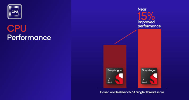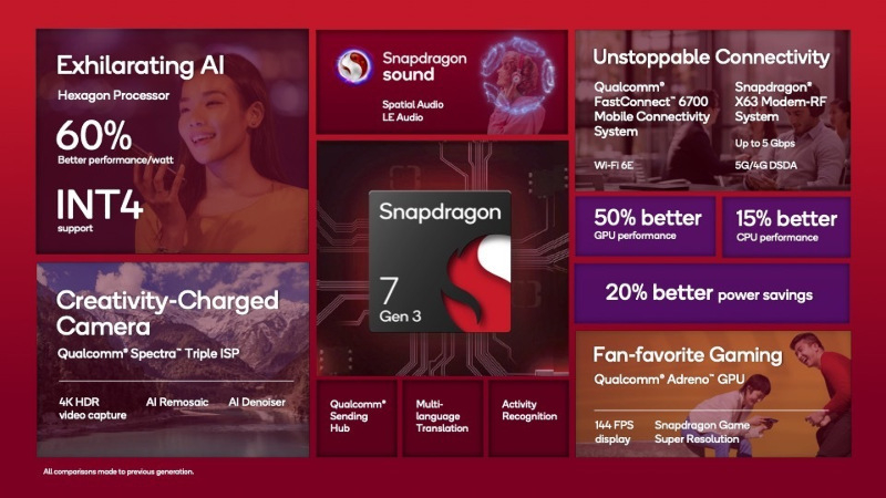 O Qualcomm Snapdragon 7 Gen 3 está equipado com um processador central de oito núcleos: um núcleo Prime com velocidade de clock de até 2,63 GHz, três núcleos de desempenho com frequência de até 2,4 GHz e quatro núcleos eficientes com velocidade de clock de até para 1,8 GHz. Curiosamente, a velocidade máxima do clock do núcleo principal do Snapdragon 7+ Gen 2 anterior é de 2,91 GHz. A nova GPU Snapdragon 7 Gen 3 é 50% mais rápida que o modelo Gen 1. Ele suporta HDR e pode suportar telas de até 144 Hz. O chip também inclui um modem 5G com suporte para bandas mmWave e sub-6GHz com velocidades de download de até 5 Gbps – a Geração 1 e a Geração 2 tinham até 4,4 Gbps. Wi-Fi 6E é compatível com velocidades de até 2,9 GHz. A Qualcomm observou que o chip Gen 3 é 20% mais eficiente que o Gen 1, e a tecnologia Quick Charge 5 suportada ajudará os dispositivos a carregar de 0 a 50% em apenas cinco minutos.