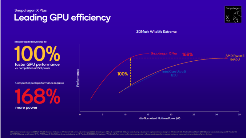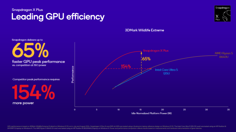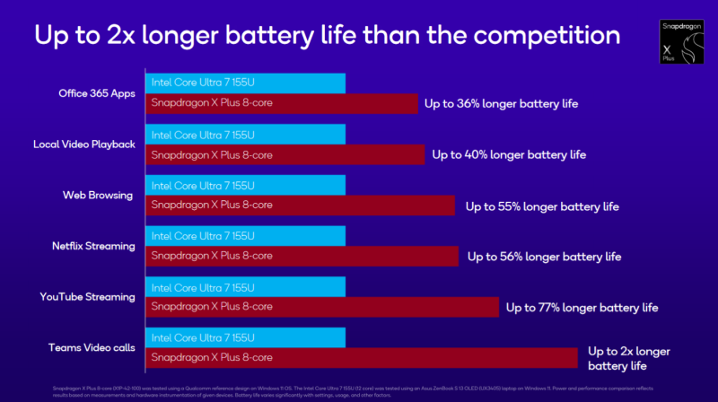 A Qualcomm enfatiza que seus processadores são mais eficientes em termos de energia e proporcionam maior duração da bateria do laptop do que os concorrentes para uma variedade de tarefas de trabalho e entretenimento. O Snapdragon X Plus X1P-46-100 pode, teoricamente, fornecer 36-100% mais vida útil da bateria em comparação com laptops baseados em Intel Meteor Lake. No entanto, a situação pode ser diferente com os mais recentes chips Lunar Lake da Intel, já que a Intel afirma que os laptops equipados com esses chips poderão durar até dois dias com bateria. Os processadores AMD Strix Point perdem em eficiência energética porque consomem mais energia em comparação com as soluções Intel e Qualcomm.