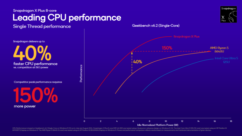 O processador Snapdragon X Plus X1P-46-100 é comparado com o Intel Core Ultra 5 125U e AMD Ryzen 5 8640U. De acordo com a Qualcomm, seu chip oferece desempenho single-core até 79% mais rápido e desempenho multi-core 40% mais rápido em comparação com soluções AMD e Intel em TDPs de 10 a 20 W.
