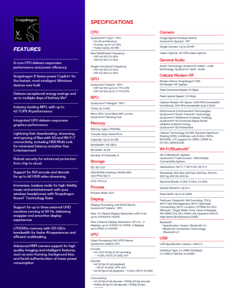 As especificações dos processadores Snapdragon X Plus X1P-46-100 e X1P-44-100 incluem suporte para três portas USB 4.0, Wi-Fi 7, Bluetooth 5.4 e Bluetooth LE, até 64 GB de RAM LPDDR5X-8488 de oito canais e possibilidade de exibição de imagens em três monitores com resolução 4K e 60 Hz (dois com HDR). Os fabricantes de laptops também podem equipar opcionalmente suas soluções baseadas em processadores Qualcomm com um modem X65 5G.