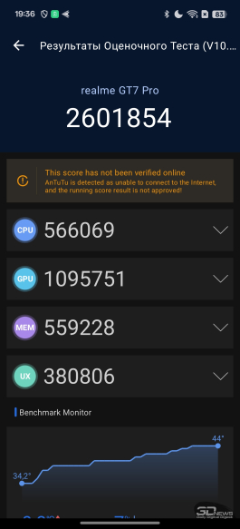 Mas uma potência tão séria está associada a um aquecimento significativo – e, infelizmente, testes (e simples impressões táteis) confirmam os dados recebidos anteriormente sobre esta plataforma. O smartphone (apesar do sistema de resfriamento avançado declarado) não conseguiu completar um único teste de recursos do pacote Qualcomm devido ao superaquecimento. E durante os testes no AnTuTu 10, o case esquentou até 44 graus Celsius – esse ainda não é um valor crítico, mas trabalhar com o smartphone já é desconfortável.