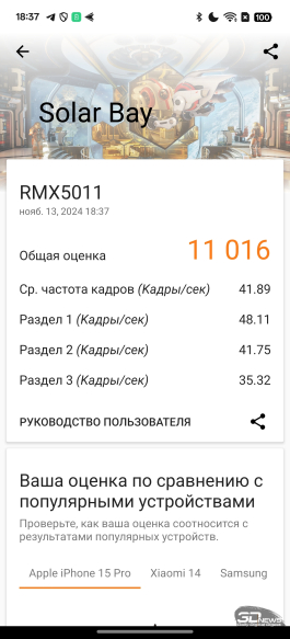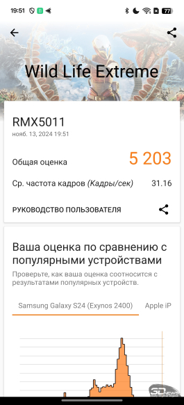 E, finalmente, sobre eficiência energética. O smartphone realmente funciona por muito tempo com uma carga – mesmo sob carga pesada (jogos, gravação de vídeo), ele não “consome” ativamente a bateria. Mas conclusões objetivas são impossíveis aqui – o realme GT 7 Pro está equipado com uma bateria de até 6300 mAh, e é impossível atribuir completamente a boa “capacidade de sobrevivência” do gadget aos méritos do processador.
