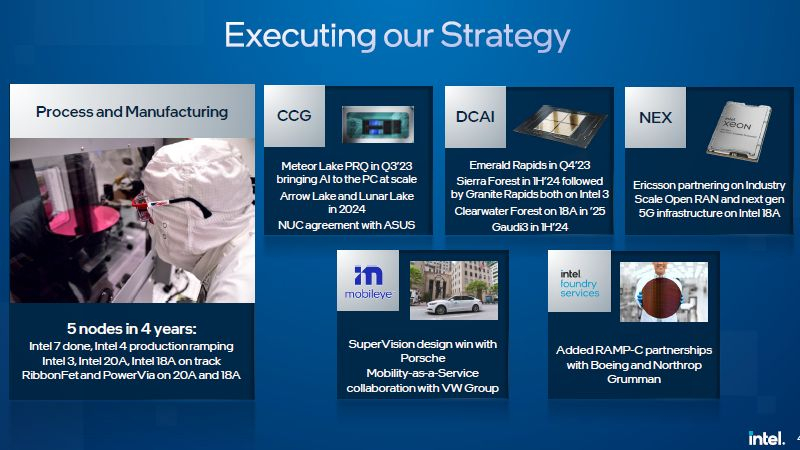 Como de praxe, a direção da empresa não perdeu a oportunidade de confirmar que o plano de desenvolvimento de cinco novos processos técnicos em quatro anos está sendo executado de acordo com o cronograma ou antes dele. O processo Intel 7 já está em produção em massa, com processadores clientes Meteor Lake programados para serem anunciados no segundo semestre do ano, que não apenas oferecerão o primeiro processo Intel 4 de litografia EUV, mas também aplicarão a tecnologia de empacotamento espacial Foveros a produtos convencionais .
