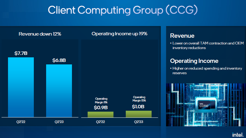 No segmento de clientes, a receita da Intel no segundo trimestre caiu 12%, para US$ 6,8 bilhões, o lucro operacional aumentou 19%, para US$ 1 bilhão, e a margem de lucro operacional aumentou de 11% para 15%. Consistentemente, o lucro operacional dobrou, impulsionado por receitas mais altas e melhor estrutura de custos. A queda de receita nessa área foi facilitada pela contração geral do mercado e pelas contínuas tentativas dos fabricantes de se livrar dos estoques acumulados de processadores e outros componentes para PCs. Conforme explicou o chefe da Intel, os estoques no segmento de PCs voltaram aos níveis normais, os clientes retomaram a compra de componentes. De acordo com a Canalys, o mercado de PCs caiu apenas 11,5% no segundo trimestre, enquanto os dois trimestres anteriores caíram cerca de 30%. Preço médio de venda dos componentes do cliente,