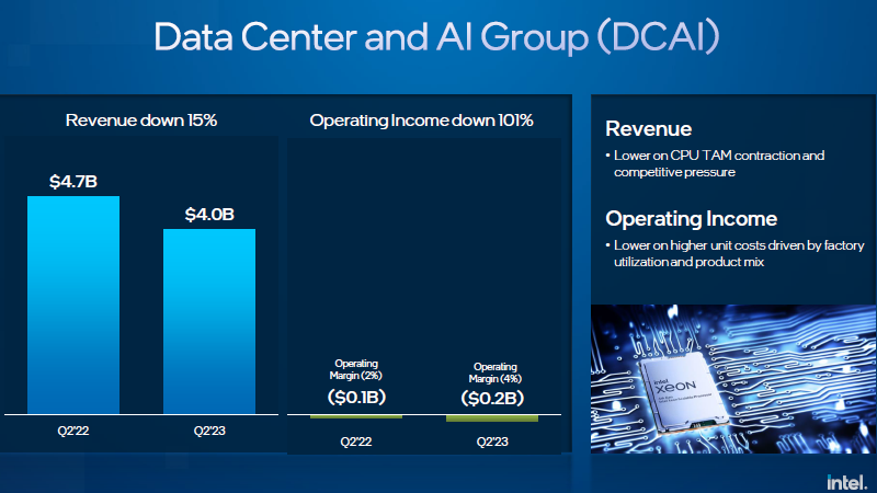 A pressão competitiva somada a fatores negativos no segmento de data center e inteligência artificial, a receita caiu 15% para US$ 4 bilhões e as perdas operacionais dobraram para US$ 200 milhões, bem como uma mudança desfavorável na estrutura de vendas por modelos de processadores. A Intel conseguiu manter sua participação de mercado no segmento de processadores para servidores, bem como aumentar o preço médio de venda em 3% e 17% sequencialmente ano a ano. Além disso, a empresa informou sobre a próxima entrega do milionésimo processador Intel Xeon Scalable de quarta geração.