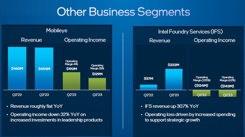 A divisão Mobileye, especializada em soluções de piloto automático, se saiu relativamente bem. A receita permaneceu perto dos US$ 454 milhões do ano passado, enquanto a receita operacional caiu 32%, para US$ 129 milhões, devido à necessidade de gastar mais dinheiro no desenvolvimento de novos produtos. A divisão de contratos da Intel geralmente quadruplicou em receita para US$ 232 milhões, mas as perdas operacionais aumentaram de US$ 134 milhões para US$ 143 milhões, pois ainda há muito dinheiro para investir neste negócio. A administração atribuiu o crescimento da receita no segmento pós-pago a um aumento na participação dos serviços de embalagem de chips usando layouts espaciais complexos.
