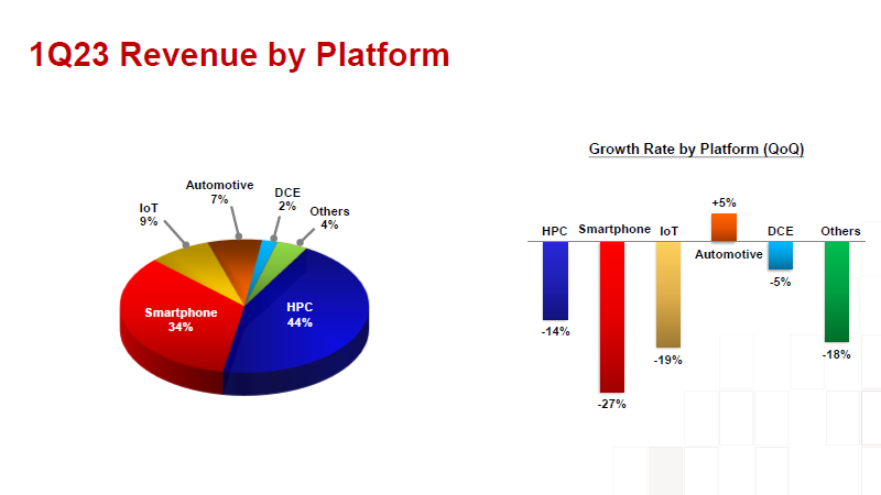 Por plataforma, a receita foi distribuída da seguinte forma: 44% foram fornecidos pelo segmento de computação de alto desempenho, apenas 34% vieram do segmento de smartphones e, no entanto, há um ano, este último representava 40% da receita da TSMC. A Internet das Coisas representou 9% da receita, sendo o setor automotivo o único a registrar um crescimento sequencial de 5% trimestre a trimestre, elevando-o para 7% da receita total da TSMC. Vale ressaltar que a receita da TSMC no segmento de smartphones caiu consistentemente imediatamente em 27%, enquanto o segmento de soluções de alto desempenho teve uma queda de 14%.