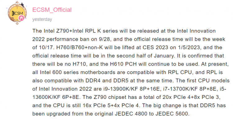 De acordo com a fonte chinesa Enthusiastic Citizen (ECSM_Official), o anúncio da 13ª geração de processadores Intel Core acontecerá em 28 de setembro, como parte do evento Intel Innovation. Os novos processadores estarão à venda em 17 de outubro. Anteriormente, a mesma fonte compartilhou dados sobre o desempenho de uma amostra de engenharia do Core i5-13600K.