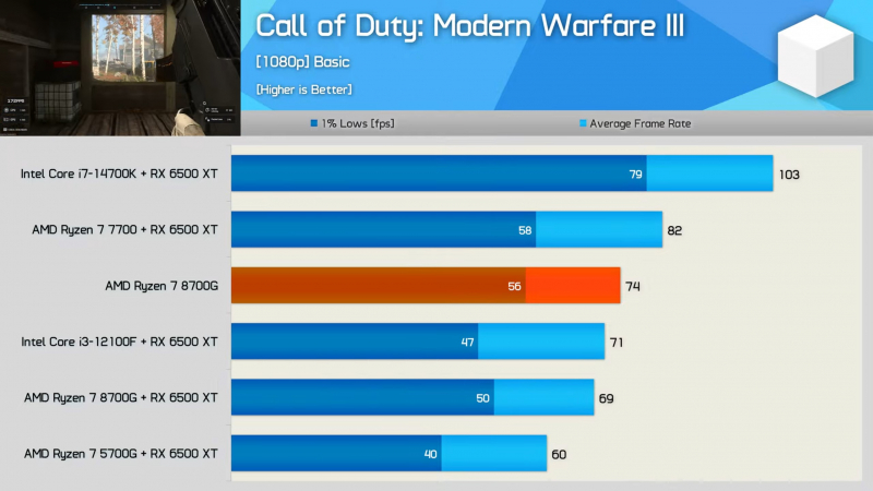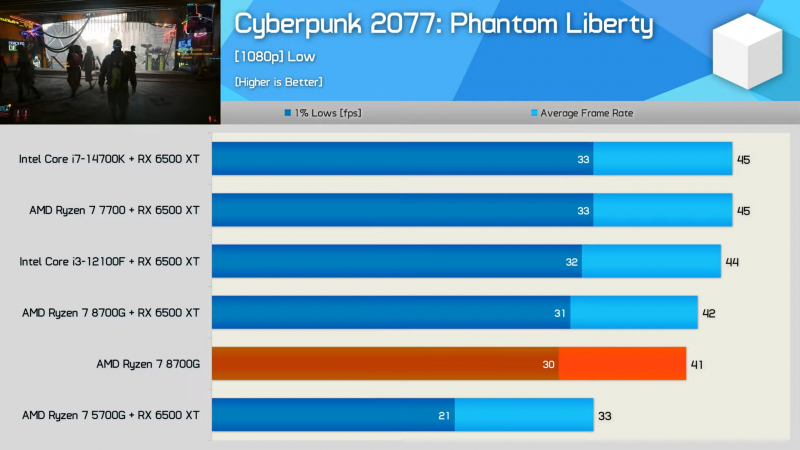 Testes no canal do YouTube HardwareUnboxed também mostraram alto desempenho dos gráficos integrados do processador Ryzen 7 8700G. E esse chip acabou sendo mais fraco que a combinação do Radeon RX 6500 XT e Ryzen 7 7700, mas foi capaz de superar a combinação do processador Ryzen 7 5700G e a mesma placa de vídeo discreta.
