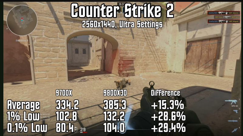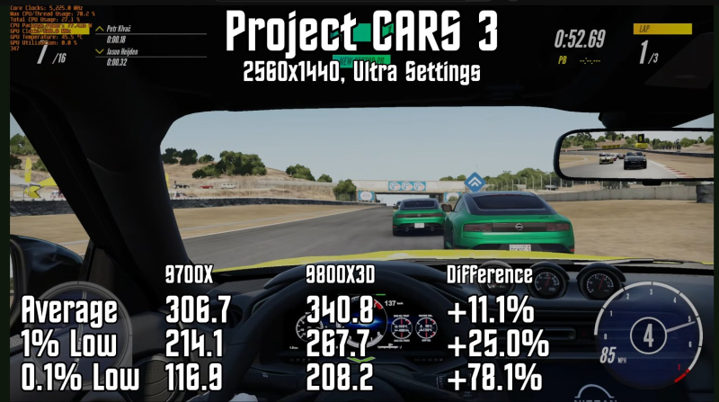 Em Project Cars 3 e Counter Strike (ambos os jogos rodaram a 1440p com configurações de qualidade gráfica máxima), o Ryzen 7 9800X3D foi em média 11-15% mais rápido que o Ryzen 7 9700X normal e 25-29% mais eficiente em termos de FPS mínimo. .