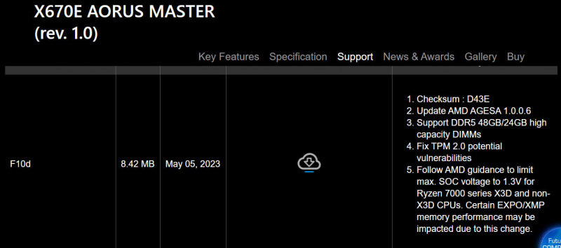 Após reclamações generalizadas sobre queima de Ryzen 7000X3D e Ryzen 7000 SoC causada por alta tensão, a AMD e os fabricantes de placas-mãe prometeram lançar novos BIOS baseados na mais recente biblioteca AGESA 1.0.0.7, limitando a tensão operacional do SoC do processador a um seguro 1,3 V. lançou o BIOS da nova versão F10d, em cuja descrição é afirmado que a tensão do SoC é reduzida a um nível seguro. No entanto, os testes mostraram que este não é o caso.
