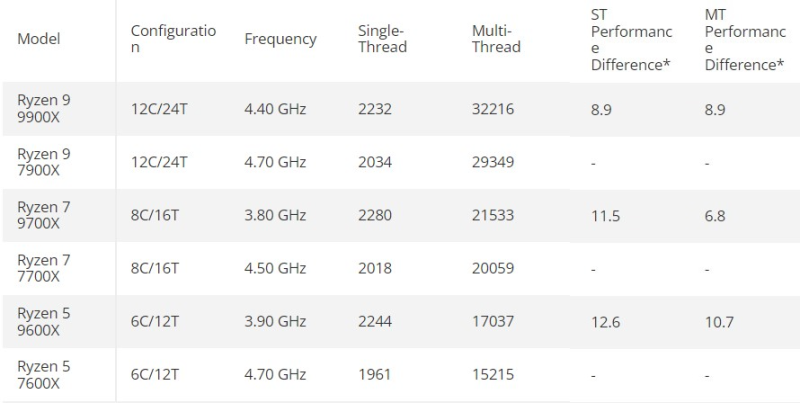 O Ryzen 9 9900X é um processador de 12 núcleos operando na faixa de frequência de 4,4 a 5,6 GHz, o Ryzen 7 9700X possui 8 núcleos com frequência base de 3,80 GHz e frequência máxima de 5,5 GHz, e o Ryzen 5 9600X é um processador de seis núcleos com frequência base de 3,90 GHz e pode fazer overclock automático para 5,4 GHz.