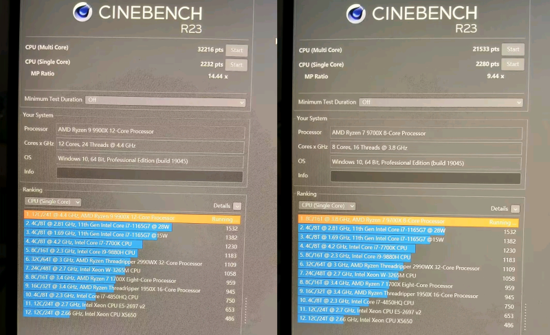 Os resultados dos testes de desempenho dos mais recentes processadores Ryzen 9 9900X, Ryzen 7 9700X e Ryzen 5 9600X na arquitetura Zen 5 no benchmark Cinebench R23 apareceram na Internet. O portal Tom’s Hardware comparou-os com os resultados de seus antecessores diretos – Ryzen 9 7900X, Ryzen 7 7700X e Ryzen 5 7600X.