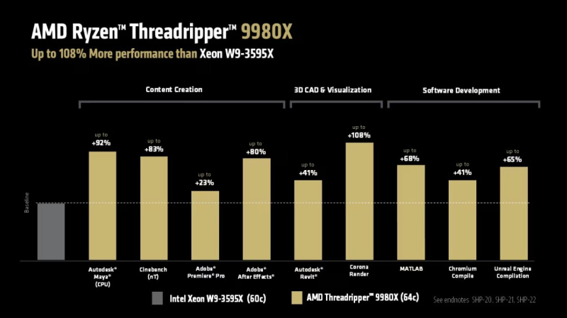 A AMD afirma que a nova série de processadores Ryzen Threadripper 9000 supera os chips da série Xeon W-3500 da Intel em diversas cargas de trabalho. De acordo com testes internos, eles renderizam uma cena até 83% mais rápido no Cinebench 2024 e aumentam o desempenho no Adobe After Effects em até 80% mais rápido.