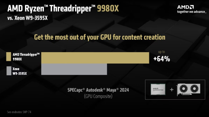 Comparado ao Intel Xeon W9-3595X, o Ryzen Threadripper 9980X oferece desempenho de GPU até 64% melhor no Autodesk Maya usando a mesma placa gráfica.