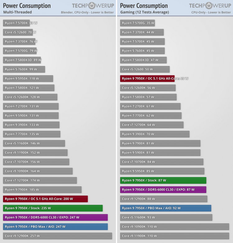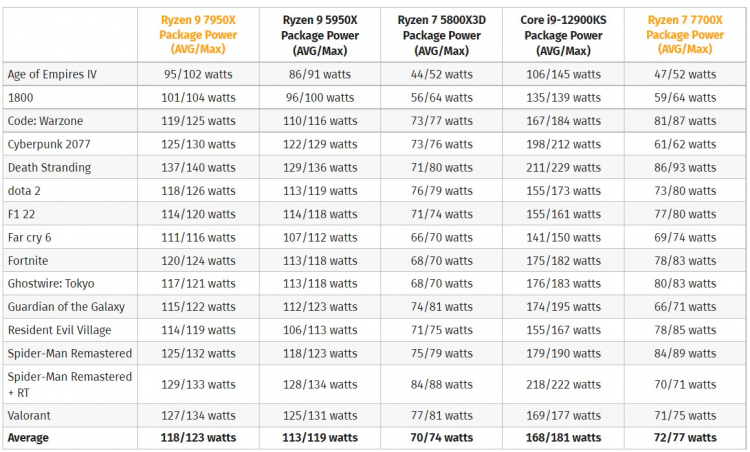 Como resultado, com carga total, o Ryzen 9 7950X consome 247 watts e o Ryzen 7 7600X apenas 99 watts. Nos jogos, o consumo é em média bem menor. Em todos os casos, o novo Ryzen consome muito menos que os concorrentes – o mesmo Core i9-12900K é capaz de “comer” até 285 watts. Mas em comparação com os antecessores da série Ryzen 5000, o consumo aumentou.