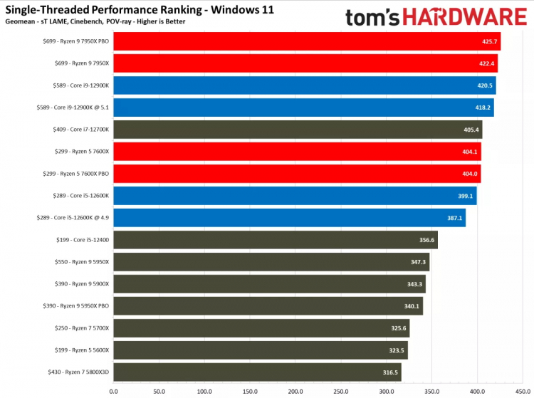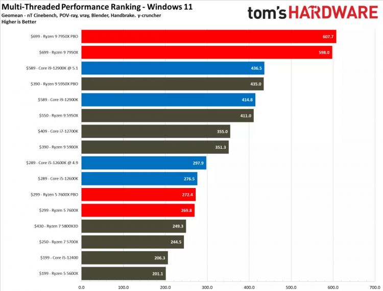 Por sua vez, o Ryzen 5 7600X mais jovem estava à frente do Core i5-12600K sem surpresas, mas não reivindicou mais nada. Mas, para ser justo, notamos que, em alguns aplicativos, até o carro-chefe Ryzen 9 7950X acabou sendo mais fraco que o Core i5-12600K. Mas são casos isolados.