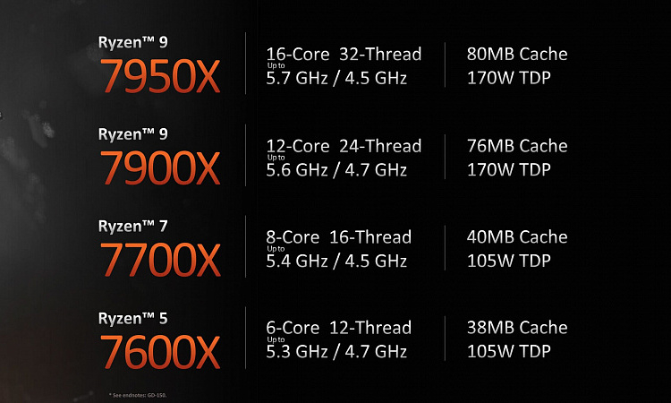 Mas primeiro, vamos lembrar que a AMD agora introduziu quatro processadores de nova geração: o Ryzen 5 7600X de seis núcleos, o Ryzen 7 7700X de oito núcleos, o Ryzen 9 7900X de 12 núcleos e o carro-chefe de 16 núcleos Ryzen 9 7950X. Todos eles usam núcleos Zen 4 e são feitos usando a tecnologia de processo de 5nm. A nova plataforma traz um soquete de processador tipo LGA chamado Socket AM5, além de suporte para memória PCI Express 5.0 e DDR5.