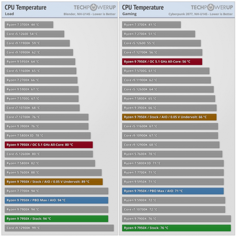 No entanto, o Ryzen 7000 acabou sendo bastante quente. Em carga máxima com um poderoso resfriador de ar Noctua NH-U14S, o Ryzen 5 7600X atingiu 88°C, enquanto o Ryzen 7 7700X, Ryzen 9 7900X e Ryzen 9 7950X atingiram 94°C. No entanto, em jogos, os números foram mais aceitáveis: 70, 71, 76 e 76°C, respectivamente.