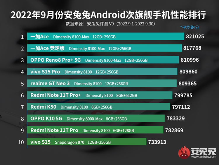 O OnePlus Ace também está equipado com o chipset Dimensity 8100-Max da MediaTek, que oferece FPS mais alto em jogos, recursos aprimorados de IA e novos algoritmos de processamento para fotografia noturna e gravação de vídeo em comparação com o Dimensity 8100 normal. Graças a essas vantagens do novo Dimensity 8100-Max, combinadas com a alta eficiência de dissipação de calor, o OnePlus Ace ficou em primeiro lugar. Além disso, os dispositivos da plataforma mencionada obtiveram o segundo e terceiro lugares na classificação.