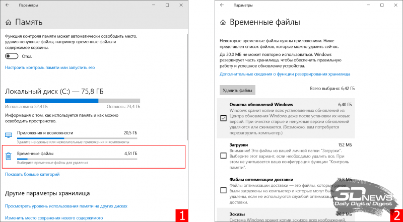 1. Usando as ferramentas de limpeza de disco integradas no Windows. A opção mais eficiente e segura, para usar você precisa seguir o menu “Iniciar → Configurações → Sistema → Memória → Arquivos temporários”. O sistema operacional analisará o conteúdo da unidade e exibirá uma lista de arquivos disponíveis para exclusão, incluindo cópias de atualizações do Windows, miniaturas de imagem, cache DirectX e serviços do sistema, logs de diagnóstico e outros dados, cujo volume total pode chegar a dez gigabytes . Alguns dos arquivos são automaticamente marcados pelo sistema para exclusão, enquanto outros são deixados a critério do usuário. Atenção especial ao trabalhar com o utilitário deve ser dada à pasta “Downloads”, que pode conter dados e documentos importantes.