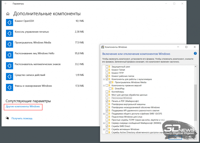 7. Desative os componentes do sistema não utilizados. O Windows inclui muitos módulos de software que os usuários raramente precisam e podem ser desativados para economizar espaço em disco. Você pode fazer isso em Configurações → Aplicativos → Componentes adicionais → Outros componentes do Windows. Na janela de configurações que se abre, você pode desabilitar o navegador Internet Explorer 11, o Windows Media Player, as ferramentas do PowerShell, as ferramentas de impressão, o Windows Subsystem para Linux e outros componentes desnecessários. A desativação deste último é acompanhada pela exclusão de arquivos e bibliotecas associados do disco, bem como pela reinicialização subsequente do sistema operacional. Se necessário, os módulos de software desativados podem ser reativados posteriormente – o Windows baixará automaticamente todos os arquivos ausentes da Internet.