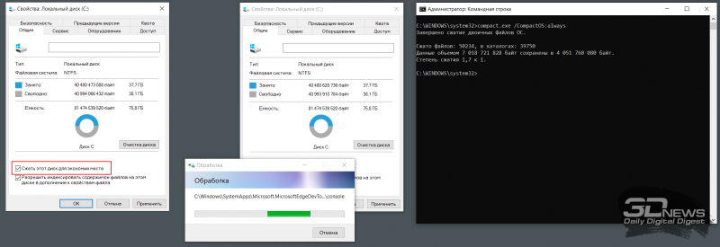 De acordo com Outsidethebox.ms, um site especializado em soluções de software da Microsoft, o uso da tecnologia Compact OS pode economizar até 40% do espaço em disco. Pontuação impressionante! Ao mesmo tempo, você precisa entender que compactar arquivos em tempo real, tanto no nível do sistema de arquivos quanto usando ferramentas do Windows, requer alguns recursos de computação e, portanto, você precisa suportar um pequeno (na maioria dos casos, quase imperceptível) desaceleração do computador. Para retornar as configurações padrão do SO e desabilitar a compactação NTFS, você sempre pode desmarcar a caixa de seleção correspondente nas configurações do disco do sistema e, para desativar o Compact OS, use a instrução compact.exe /CompactOS:never.