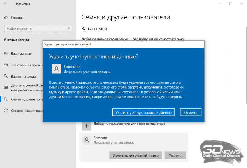 6. Removendo contas extras. Muitas vezes, a razão para sobrecarregar um disco de computador são contas de usuário do Windows não utilizadas e há muito esquecidas que armazenam documentos, fotos, músicas e outros arquivos sem valor, mas ocupando espaço. Você pode se livrar de contas antigas e expiradas na seção “Configurações → Contas → Família e outros usuários”. Este procedimento só é possível se você tiver direitos administrativos no sistema.