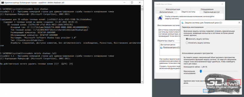 3. Excluindo cópias de sombra e pontos de restauração. Dependendo das configurações, o Windows cria automaticamente instantâneos de volume de disco, cópias de backup de arquivos do sistema e documentos do usuário. Se o sistema estiver funcionando como um relógio e não houver dúvidas sobre a confiabilidade do armazenamento de dados, esses backups podem ser excluídos e, assim, liberar espaço em disco. Para fazer isso, abra um console com direitos de administrador, digite o comando vssadmin list shadows para listar as cópias de sombra existentes na unidade e digite vssadmin delete shadows /all para excluí-las. Um resultado semelhante pode ser obtido abrindo as configurações de proteção do sistema (menu “Iniciar → Configurações → Sistema → Sobre o sistema → Proteção do sistema → Personalizar”) e clicando no botão “Excluir”.