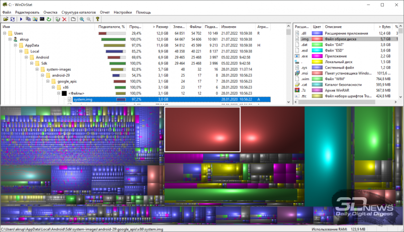 8. Análise do conteúdo do espaço em disco. Para resolver este problema, recomendamos o uso do utilitário gratuito WinDirStat, que verifica os arquivos armazenados no disco e exibe o espaço que ocupam na forma de um mapa gráfico visual, o que facilita o isolamento dos “pesos pesados” de uma enorme matriz De dados. O aplicativo ajuda você a ver uma imagem detalhada do uso do espaço em disco e descreve as etapas para excluir arquivos desnecessários.